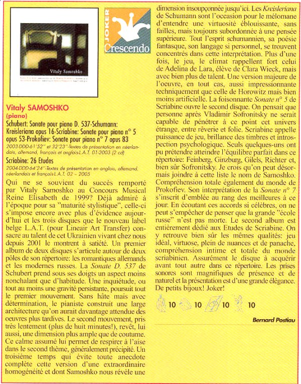 De Oekraïner Vitaly Samoshko (32) won in 1999 glansrijk de Elisabethwedstrijd met het 3e Pianoconcerto van Rachmaninov, en op zijn debuut-cd stonden ondermeer Prokofiev en Scriabin. Zijn verbondenheid en affiniteit met de Russische muziek, en meer bepaald met Alexander Scriabin, blijkt ook uit deze cd met de volledige Etudes. In 2003 vertelde Samoshko me over Scriabin: “Ik vind hem een fantastisch componist. Zijn vroege werken klinken melodieus en licht als Chopin. Ze liggen helemaal in de romantische sfeer. Zijn latere werken zijn daarentegen modern, duister, mysterieus. Het is zeer kleurrijke muziek met een grote gelaagdheid. Verschillende stemmen lopen door elkaar, vaak contrapuntisch in één hand. Je kunt met deze muziek heel wat aanvangen wat het toucher betreft. Ook door in te spelen op de akoestiek van de ruimte bereik je mooie effecten.” Toen Samoshko dit vertelde was hij nog volop in de studeerfase en keek hij bijzonder uit naar de opname in Flagey. Nu is de opname klaar en het resultaat is ronduit prachtig: pianistiek betoverend, en opnametechnisch gaaf. Het toucher van deze pianist is uitgebalanceerd, helder, intens van uitdrukking. De vele noten gaan niet over in een kluwen van wolligheid, maar blijven helder doorklinken in het virtuoze pianospel. De bekendste etude (dankzij Horowitz!) is het op.8 nr.12. Hierin merk je het best hoe Samoshko zijn krachten wonderlijk weet te doseren, en de muziek geleidelijk weet op te bouwen tot een magistrale architectuur. Zijn etudes op.8 nog een en al contemplatie en vrede – “om het destructieve intellect even tot rust te brengen”, aldus de componist – dan zijn de latere etudes op. 42, 49, 56 en 65 geheimzinniger, ‘mystieker’ van uitdrukking. Je hoort meer en meer verbrokkeling, het wordt minder bevattelijk, labieler van tonaliteit. Sommige etudes lijken on-af. Een toonaard is er nog amper te bespeuren, ookal geeft Scriabin die aan. Ook hier gaat Samoshko als een klanktovenaar te werk en weet hij alle nuances en kleuren in de partituur te ontrafelen. Veel goede opnames zijn allerminst te vinden van de Etudes van Scriabin. Deze is werkelijk een aanrader.