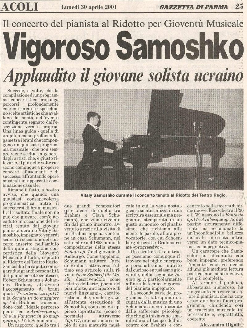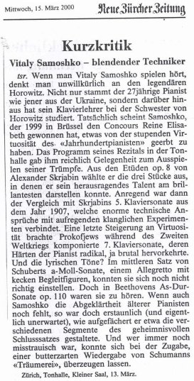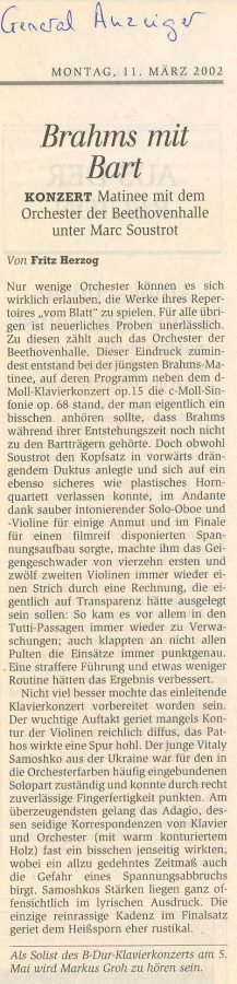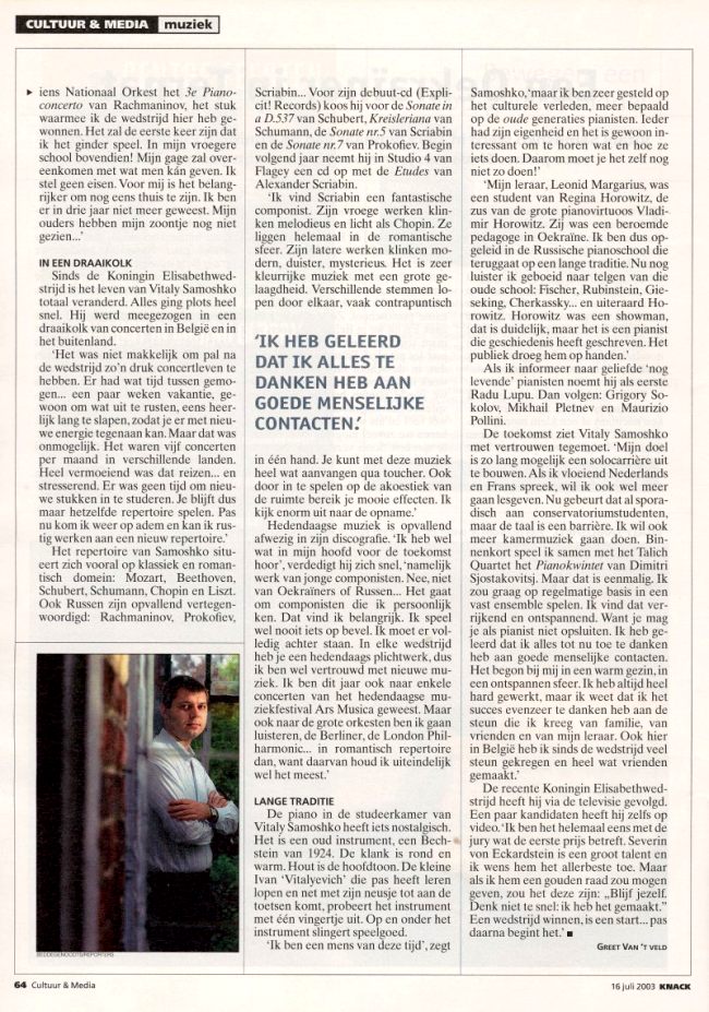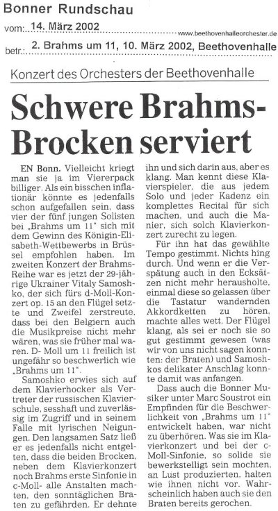 Pianist Vitaly Samoshko, afkomstig uit de Oekraïne, liet een bezeten en imposant spel horen. Hij triomfeerde met een katachtige technische souplesse in zijn weerbarstige en veeleisende partij.Sarcastisch beitelende passages en lyrische frases met een beeldschoon toucher wisselden elkaar af. Zelden kon men het perpetuum mobile van het Scherzo zo wervelend en ruisend horen. De klingelende GSM in de zaal, natuurlijk net op een stil moment, kon de concentratie van de virtuoos geenszins verstoren. Hij was te intensief één met Prokofjev.