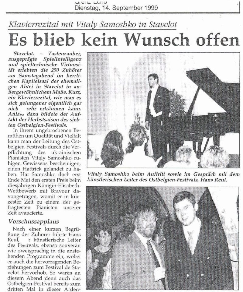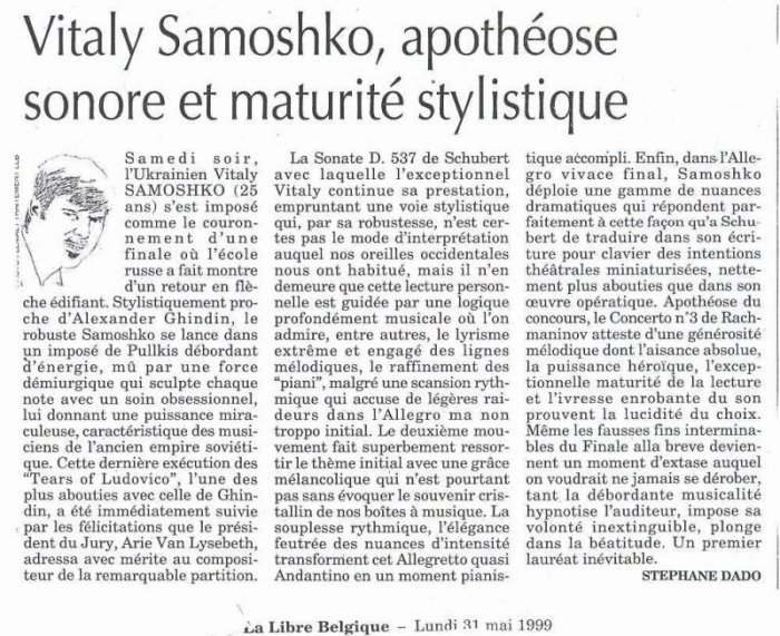 A laureate of the Lysenko National Competition in Kyiv in 1989 and finalist at the Sydney (Australia) International Piano Competition in 1992, Mr. Samoshko won the second prize of the prestigious Busoni International Competition in Italy, where he also received three special awards for the best interpretations of the Beethoven Sonata, the Concerto and the Liszt Études. More recently, he was laureate of the Pretoria International Music Competition in South Africa (1994) and won second prize in the Senigalia International Piano Competition in Italy (1995).